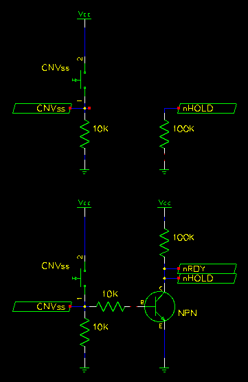 The top half of this schematic is the original circuit. nHOLD is tied low as the programming monitor requires it that way. The bottom half is my modified circuit. nHOLD and nRDY are tied high (as required by memory expansion mode), unless you jumper CNVss for programming, in which case the transistor pulls them low. |
